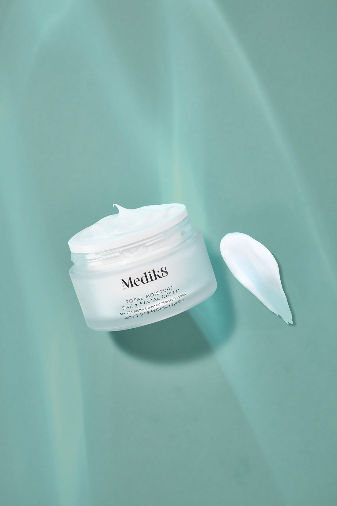 Advanced Night Restore is Medik8’s signature age-defying night cream. It is designed to help smooth and firm the look of stubborn lines and wrinkles. We recommend it to those who want to achieve a more youthful-looking complexion, as well as those who want to boost the visible age-defying benefits of Crystal Retinal (as part of a nighttime regime). Total Moisture Daily Facial Cream is our AM/PM daily hydration cream. It’s designed to visibly plump and smooth the look of skin while giving the complexion everything it needs for daily moisture and optimal skin health. It is suitable for all skin types and can be used both day and night.