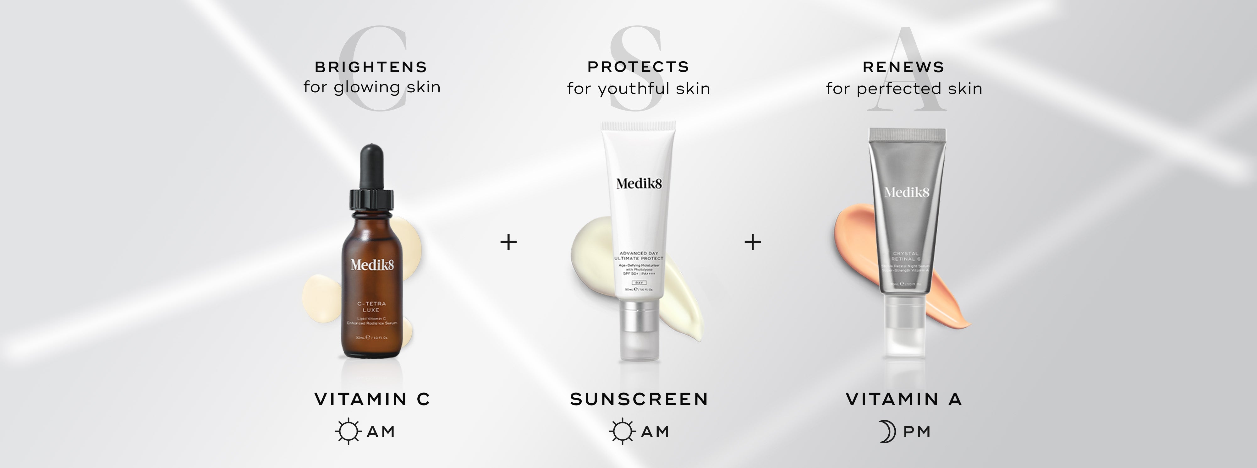 Não sabe por onde começar com os seus cuidados de pele? Desbloqueie a abordagem simples e clinicamente comprovada para uma pele jovem e radiante - tanto instantaneamente como ao longo do tempo. É tão fácil quanto usar vitamina C mais protetor solar de manhã e vitamina A (também conhecida como retinol/retinal) à noite. Chamamos a isto; a CSA PhilosophyⓇ. Na Medik8, acreditamos firmemente que qualquer grande regime de cuidados de pele deve começar com estas 3 fórmulas fundamentais. Deixe-nos mostrar-lhe porquê…