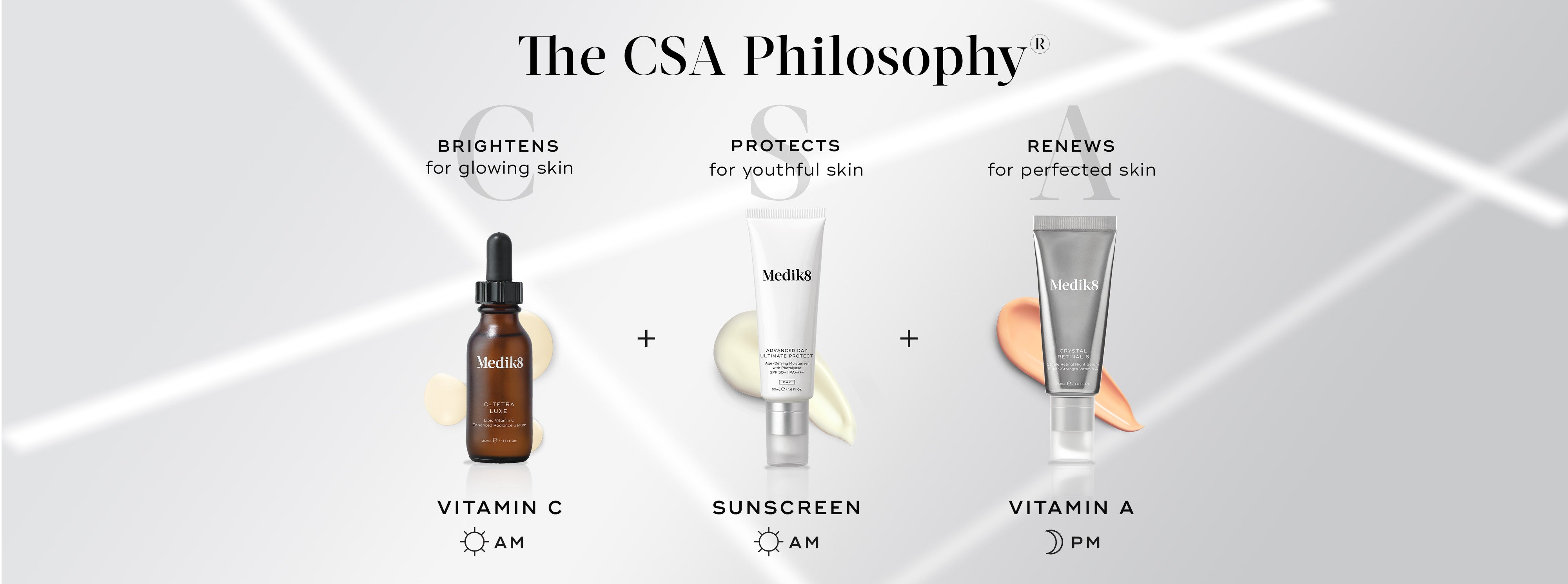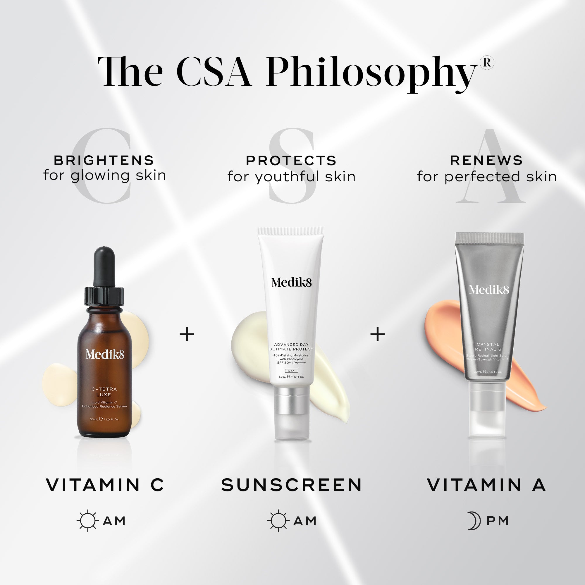 Melhore e mantenha os benefícios antienvelhecimento da vitamina A adicionando vitamina C e protetor solar à sua rotina diária de cuidados com a pele. Este trio poderoso é o santo graal para conseguir uma pele com aparência mais jovem e compõe a pioneira Filosofia CSAⓇ da Medik8: vitamina C mais protetor solar durante o dia, vitamina A à noite.